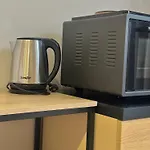 Ervaar ultiem comfort in de keuken van dit appartement, voorzien van een waterkoker, een koelkast en een oven.